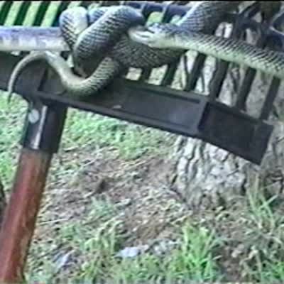 Snake wraps itself around another snake trying to eat it in backyard. Woman loses track of one of the snakes and gets scared when she finds it climbing the tree in front of her.
