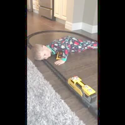 A tot boy lays on a toy train track and a toy train hits him in the face.