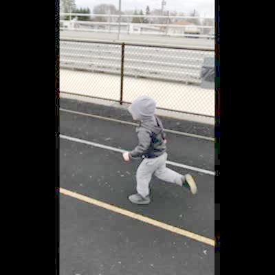 A tot boy runs under hurdles on a school track until he trips and falls when he hits his head.