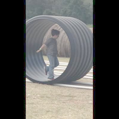 A boy walks inside a large pipe tube and it rolls down a track and it hits a hay bale at the end of the track and the boy falls. Featured talent cleared only (boy rolling the tire)