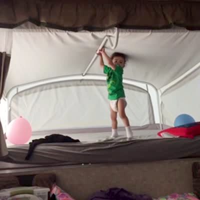 A tot boy stands up on a bed in a camper trailer and pulls on a pole on the ceiling. The pole gets unattached and the boy falls.