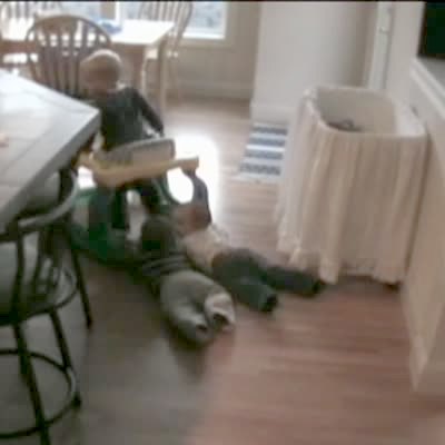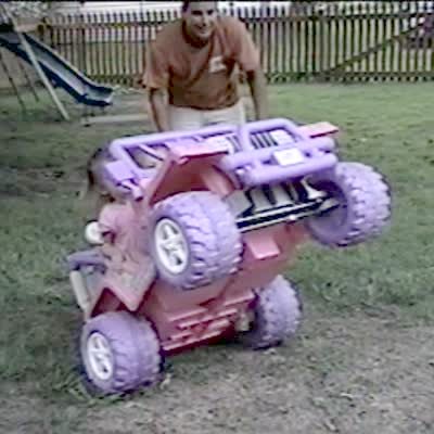 A boy instructs his tot sister on how to drive a power wheels car while he rides behind her in a trailer wagon, then hops into the car to push the gas for her when she can't figure it out. He steps back into the wagon when she hits the gas and he falls out and gets run over.