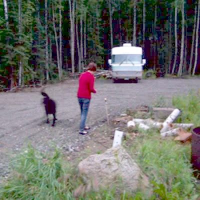 Woman lights fireworks at a wooded campsite, large black dog runs up attacks the lit fireworks. They fly across a gravel road, landing under a motor home explode.