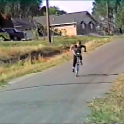 A young girl rides her bicycle onto a driveway and crashes into her brother on his bicycle. Security footage.