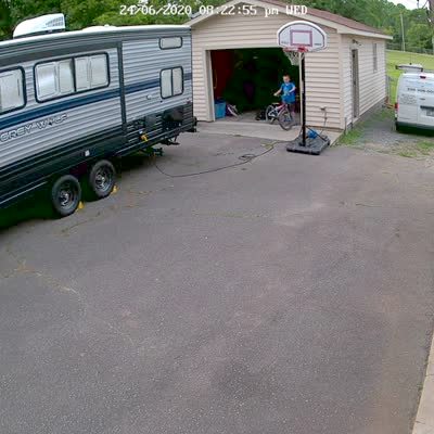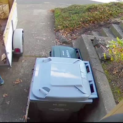 Security camera footage of a man who backs a car up in the driveway and bumps into a parked boat trailer. The trailer moves down the hill and into the yard.