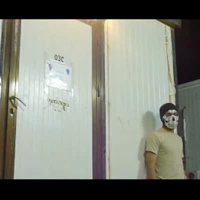 Male soldier wearing a scary mask knocks on friend's door at the military base, scares him when he opens door. Practical joke.