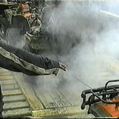 Man burns rubber/ tire on trailer and creates a lot of smoke. Burn out