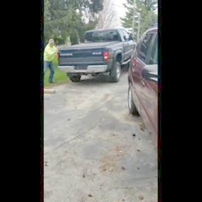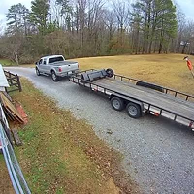 "Truck and Trailer Fail'er" After his trailer comes unhitched, a man quickly hops out of his truck to stop it but forgets to put a truck in park. The truckrolls down a driveway and into a tree. Security footage.