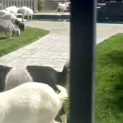 A large group of goats eat the grass and plants in a woman's backyard. She complains about how they showed up.