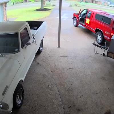 A man attempts to reverse his four-wheeler from a trailer onto the back of a truck when one of the ramps falls and he and the four-wheeler topple off to the driveway. Security footage.