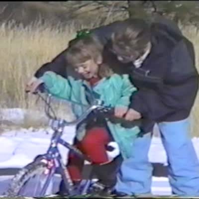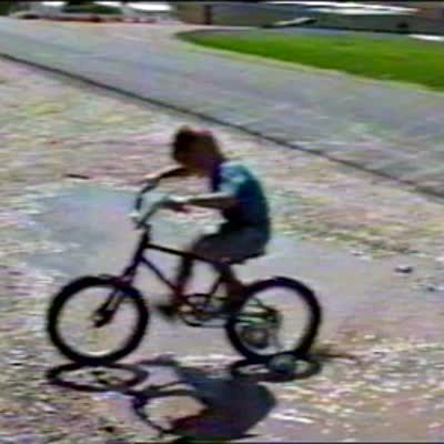 BIKE. Boy riding bike with training wheels gets stuck in mud; wheel spins, spews mud.