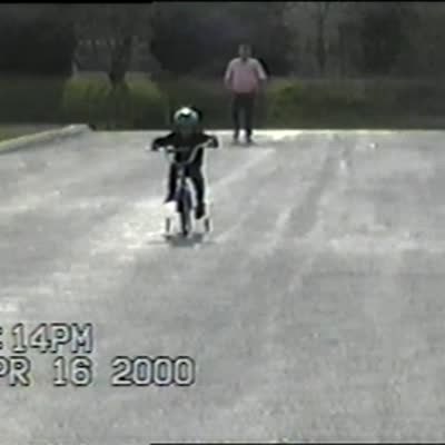 Kid on bike with training wheels rides downhill and crashes into parked car.