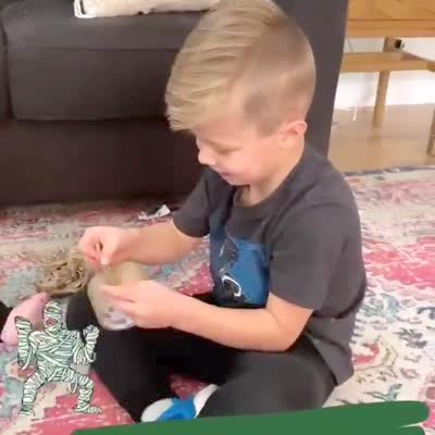 A young boy in his house wraps his younger brother with tape. A woman asks the older boy why he did it and he responds that his brother wanted to look like a mummy.