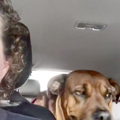 A woman drives a car and a teen girl records a video of a boxer puppy dog in the back seat the is stuck upside and rolls over to sit upright again and they laugh.