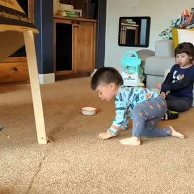 A tot boy eats from a trail of cereal snacks on the floor in a living room. Then he crawls under a box set up like a trap and gets stuck under it.
