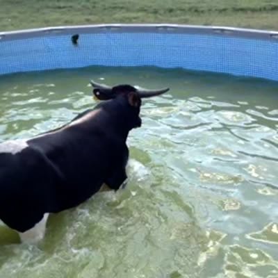 A man struggles to wrangle a bull after it climbed into an above-ground pool. The bull eventually exits through the gash in the pool it made and rejoins the herd.