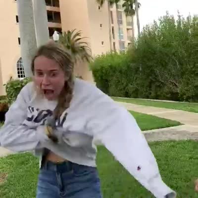 A woman holds a gecko lizard and it crawls into her sweatshirt and she screams and squirms in a park.