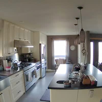 A deer breaks through a glass window and a cat runs away from it in the house. The deer walks around the kitchen and dining room, trying to find a way out. Security footage.
