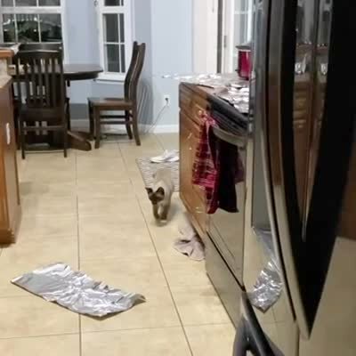 A cat jumps onto a kitchen counter covered in aluminum foil, then pushes off one side of the counter onto the other. Slow motion replay.