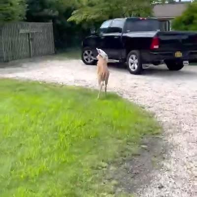 A deer gets its head stuck in a bag and runs into objects all around a yard as a man tries to help it.