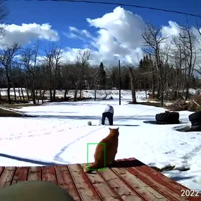 A man sets up a trap for a skunk. His cat immediately climbs into the cage and the man turns around to release it in a yard. Security footage.
