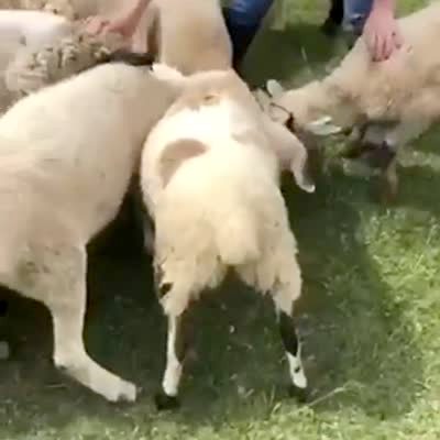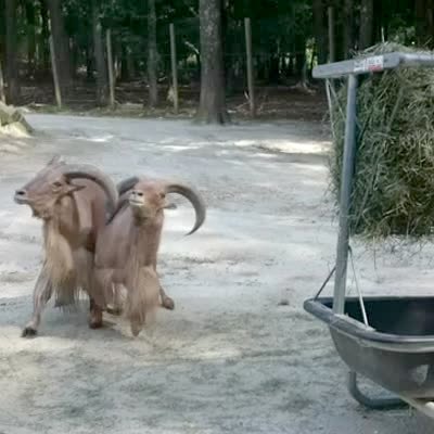 Two Barbary sheep have their horns interlocked and they can't pull away from each other. They finally free themselves only to then hook themselves together again.