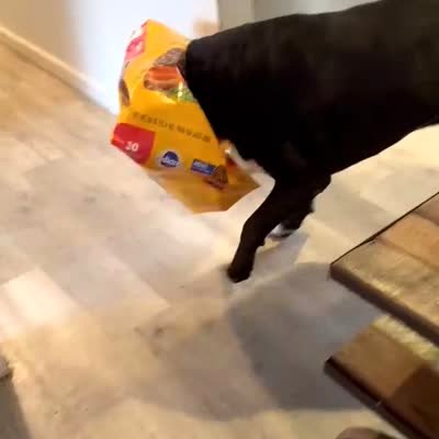 A dog is stuck inside they stand to his food bowl. He spins around several times to try to get it off. Security footage.