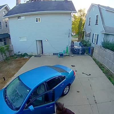 A dog opens a car door with his mouth and traps itself in the cab of the vehicle in the backyard. Ring.com. Security footage.