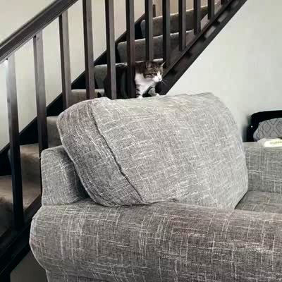 A cat tries to jump between the bars of a staircase banister and gets caught in the railing by its stomach.