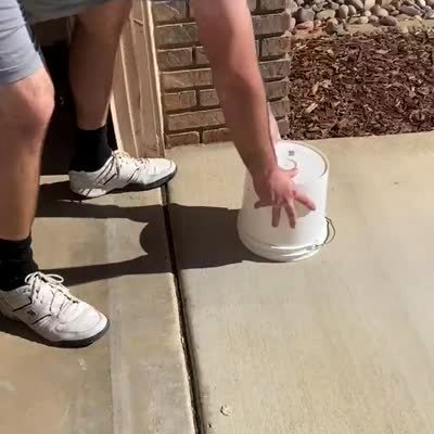 A woman and a young boy do the computer mouse in the house challenge and a man slides a bucket down the driveway and throws the mouse into the street.