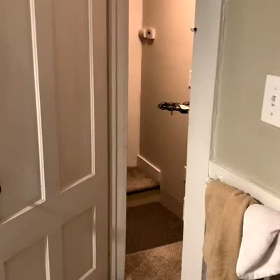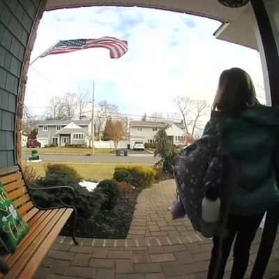 A young girl tries to walk out a home to go to school and the hood of her jacket catches on the door handle and she can't get it off until her dad helps her. Doorbell security camera.