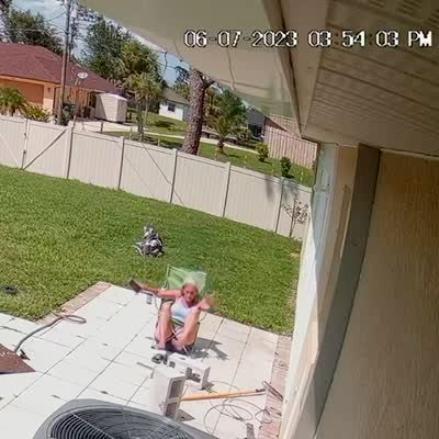 A senior woman sits in a lawn chair in her backyard. She accidentally kicks a cinder block and then her char breaks and she falls through it. Security Footage.