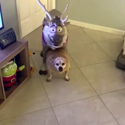 A dog in a living room has gotten itself stuck under a Sven reindeer decoration from Frozen.