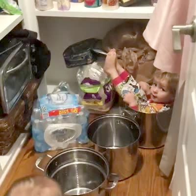 A tot boy gets stuck in a pot in the pantry and tells his mom he wants to get out.