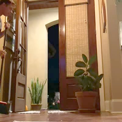A man does the computer mouse in the house prank on a woman in the foyer. He opens the front door and tells the woman to pick up the cup so he can sweep the mouse out of the house. The woman says she's scared the mouse will run at her and notices the camera. He says the camera is to show them get the mouse and tells her to pick up the cup. She flips the cup and runs away. The family laughs when they see it's a computer mouse.