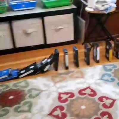 A young boy sets off a domino chain of VHS tapes and DVD cases that fall through the house and down the stairs, then the cases hit a mouse trap and launch a toy soldier into a cup. Multiple clips edited together.