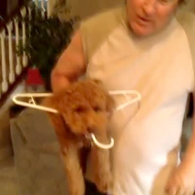 A dog gets a clothes hanger in his mouth and the other end stuck around his head.