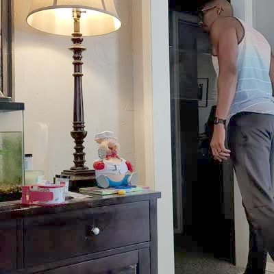 A man calls his young son into the living room, and the boy runs into a sheet of plastic wrap across the doorway.