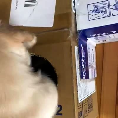 A puppy dog and a kitten cat play with each other through a cardboard box with holes in a living room. They both try to go through a hole at the same time and get stuck.
