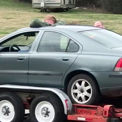 "Trapped on the Trailer" A man tries to climb out of his car's sunroof, but he cannot fit so he climbs out through the window instead. Video rotates halfway through.
