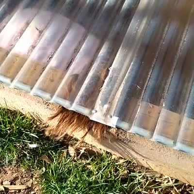A praying mantis sits on top of the garage door opener and spins when a man opens the door. The mantis then flies off the opener and a young girl screams off camera.