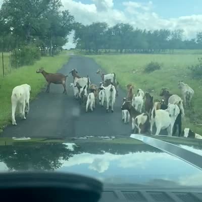 A man honks the horn of a car while a herd of goats block a street, then more goats walk into the road, but they all turn and walk into a field.