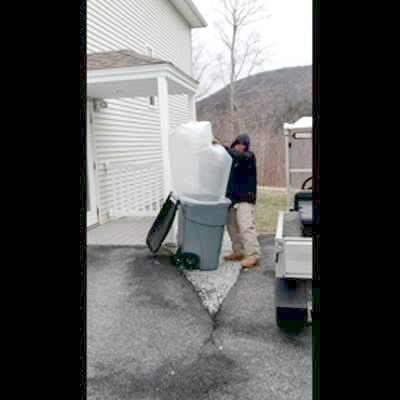 A teen boy lifts a heavy trash bag in the driveway outside of the house and throws the bag over his shoulder and falls backwards into the garage door. Security-footage.