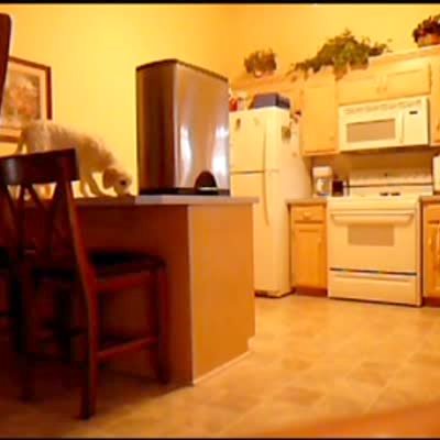 A dog snoops around a kitchen on his hind legs and knocks over a trashcan from the counter.