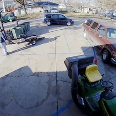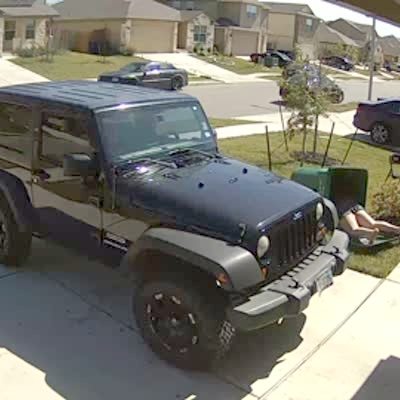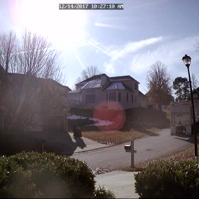 A teen girl carries a bag of trash to a trashcan at the end of the driveway and throws the bag in the can. She looks at her phone while she walks back to the house and hits her face on a metal pole/rebar that hangs out of the bed of a parked truck. Home security camera
