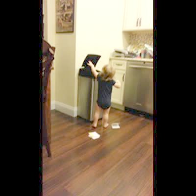 A woman asks her tot daughter if she finished her food indoors. She says yes and her mom asks "Do you care if I go check the garbage can?" The girl runs away screaming "no!"