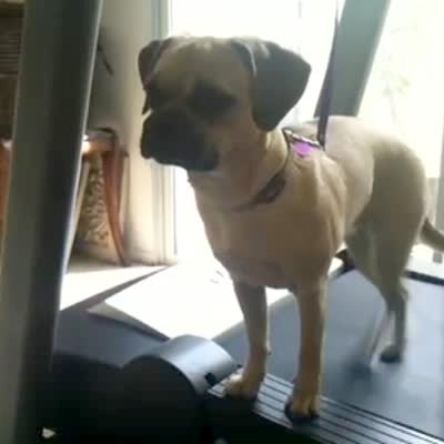 Treadmill Mutt A mix breed dog stands sideways on the edge of a treadmill with its front legs off the side of the tread mill. Its back legs walk sideways on the treadmill in a living room.