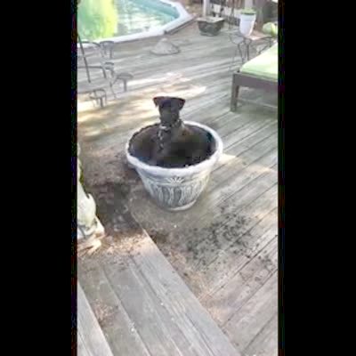 A dog plays around inside a flower pot and gets the dirt all over the deck floor. His owner berates him but he ignores her and then finds his bone in the dirt and hops out.