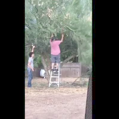 A man gets knocked off of a ladder as he cuts a dead branch off of a tree.