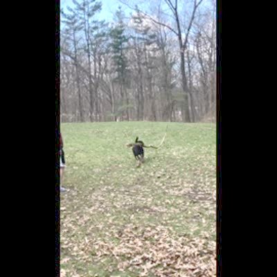 A man curses in a field when his dog hits him in the groin with a large tree branch.